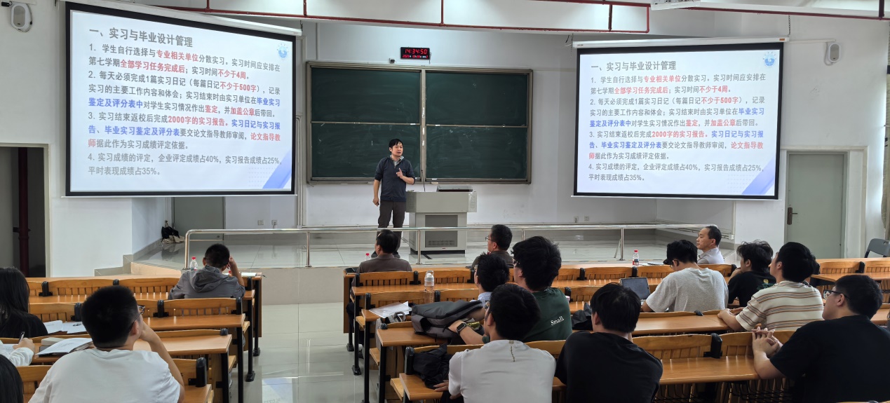 会上,机械工程系主任叶永权首先就毕业设计与毕业实习两大关键教学环节进行了详细说明。他系统介绍了毕业设计各阶段的时间节点与进度安排,明确了毕业实习的具体要求与注意事项,为毕业生们顺利完成学业、衔接就业奠定了坚实基础。