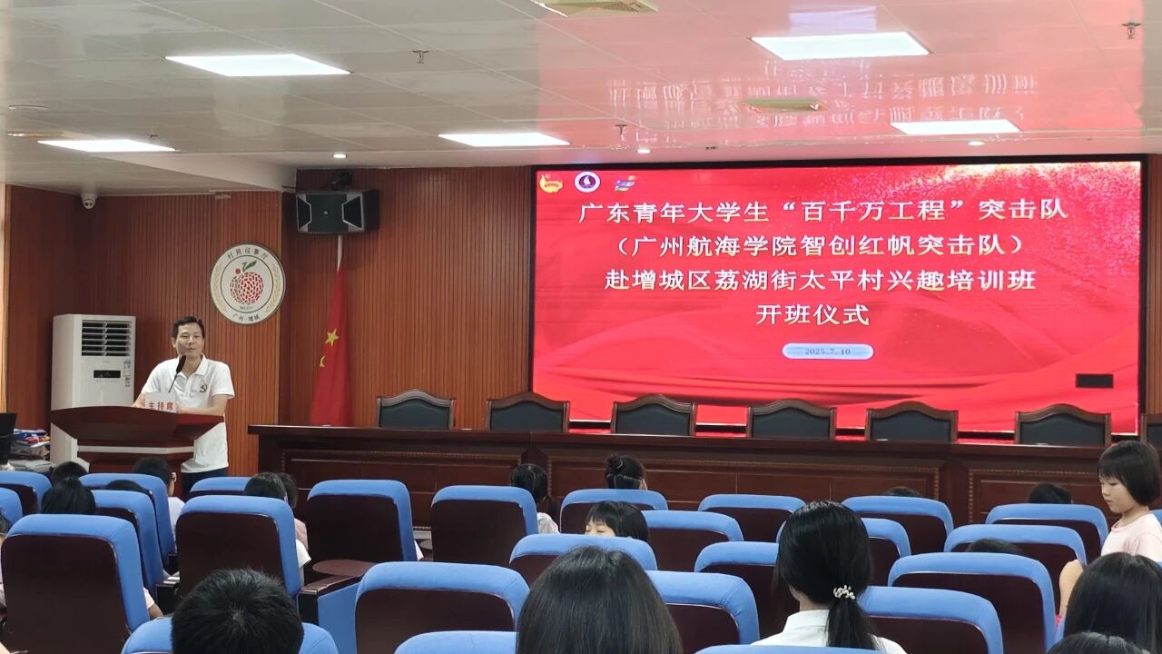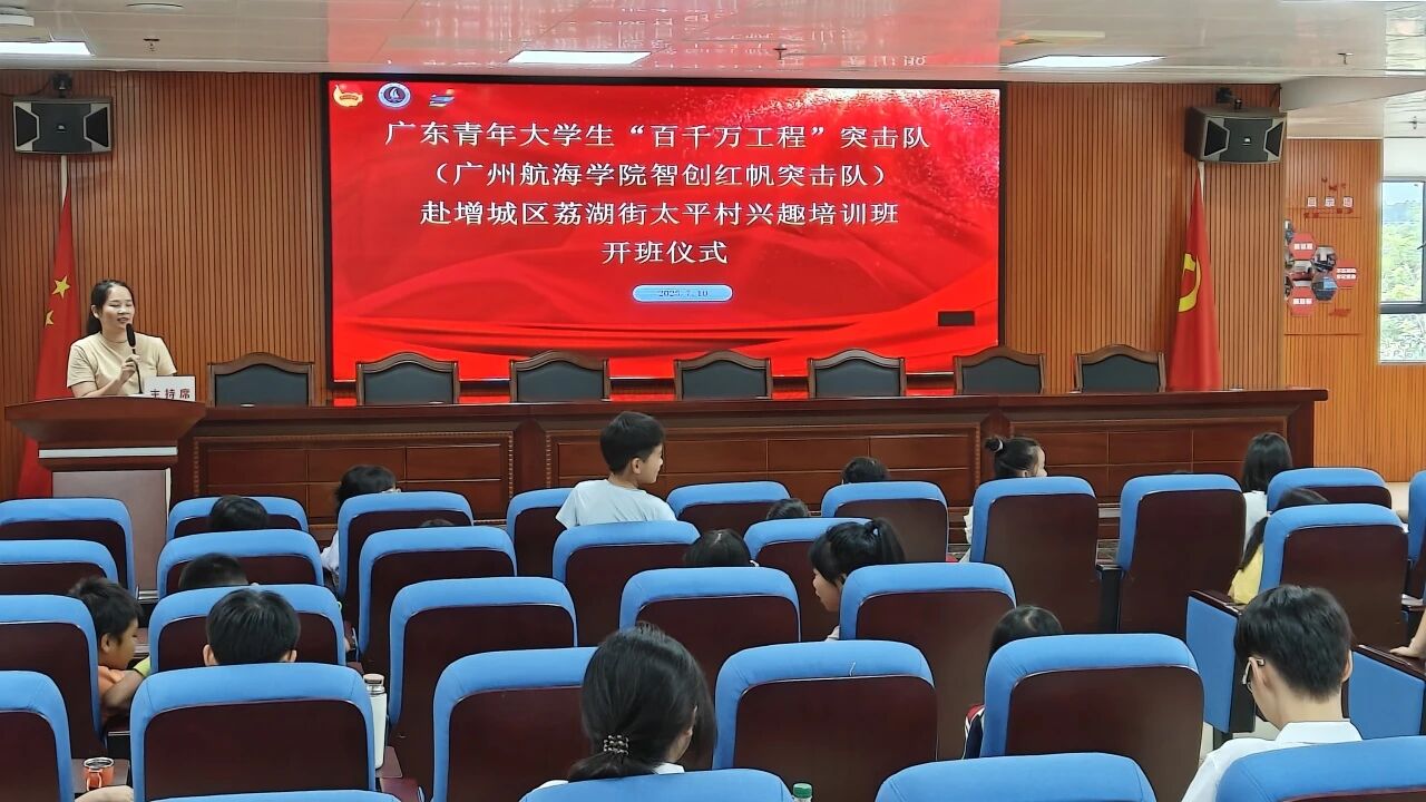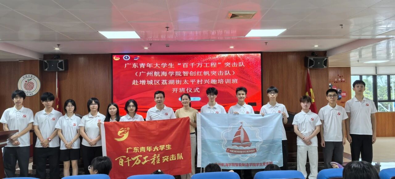 为积极响应广东省委“百县千镇万村高质量发展工程”的部署,7月10日,广州航海学院“智创红帆”突击队赴增城区荔湖街太平村开展暑期社会实践,成功举办首期乡村儿童夏令营兴趣班。太平村党总支委员、村委会委员刘玉媚,智能制造学院学生党支部书记谭文才,突击队全体队员及40余名学员共同参与开班仪式。